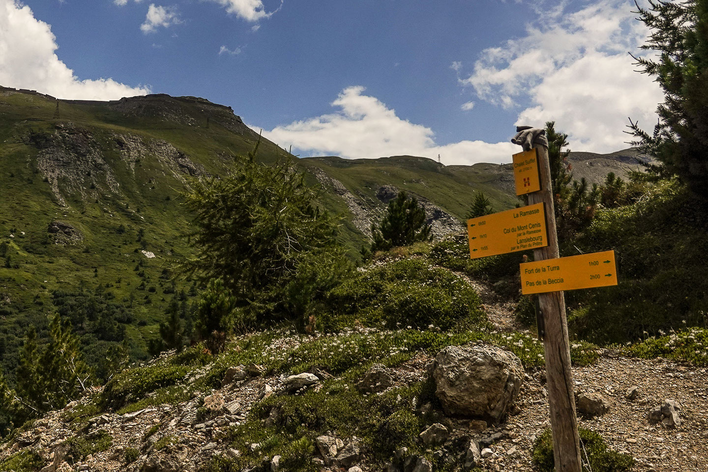 Unten angekommen geht's durch das Tal der L'Arc in Richtung Mondana bis nach Landslebourg-Mont-Cenis, wir machen dort unsere Mittagspause bevor es zum Col du Mont Cenis weiter geht. Dort wenige Meter vorm Passschild zweigt ein Schotterweg rechts der Straße ab der uns zum Fort de la Turra führen wird, ich bin sehr gespannt und in freudiger Erwartung.