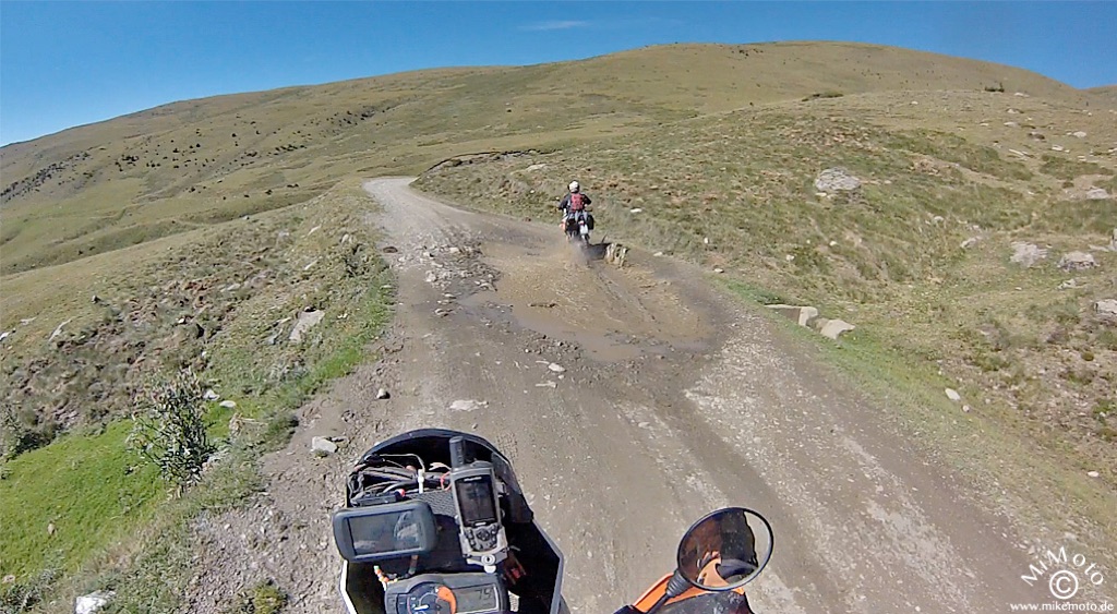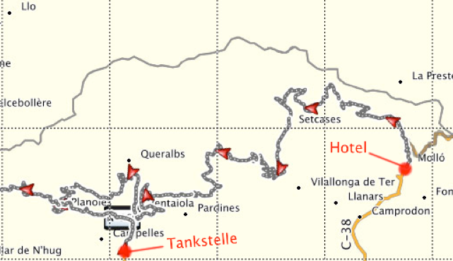 Vom Frühstück bis zum Start vergehen gut und gerne 60 Minuten und bestens gelaunt geht es in den 2. Tag der Pyrenäenreise. Nach wenigen Kilometern in Richtung Norden verlassen wir die C-38 und biegen in Richtung Setcases wo die Straße sich schon nach kurzer Zeit in eine schöne Schotterstrecke verwandelt.