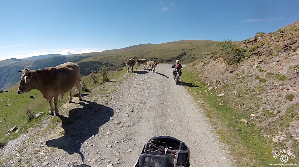 Campelles kann nicht mehr weit sein. Bald sollte sich dieser schöne Höhenweg zwischen Molló, wo wir heute Morgen gestartet sind, wieder herab schrauben. Wir fahren schon eine ganze Weile, für unsere Verhältnisse recht zügig, da wir heute noch in Andorra meinen neuen Reifen montieren lassen wollen. Ich weiß gar nicht was es für einer sein wird. Eventuell der TKC – ein Reifen von dem ich nicht so recht begeistert bin. Nicht weil er nix taugt, sondern weil er auf der 690er hinten einfach nur so weg dampft und dazu braucht es nicht einmal viel Zug an der Gashand.